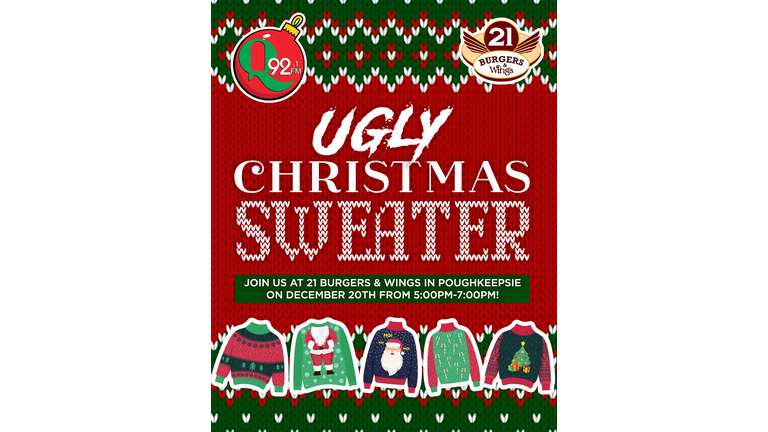 Poughkeepsie, it’s time to sleigh the holiday season at the Ugly Christmas Sweater Party! Join us at 21 Burgers and Wings on Saturday, December 20th from 5 to 7 PM—and guess what? It’s totally FREE! Pull out those sweaters that are so bad they’re snow good—because the ugliest one could win you $500! That’s right, your tacky threads could stuff your stocking with serious green! So don’t be a Grinch—eat, drink, and be tacky! December 21st, 5 to 7 PM at 21 Burgers and Wings in Poughkeepsie. Wrap up the year in style—ugly style! See you there!